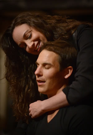 Rick Blunt plays Falstaff playing Henry IV during the play-acting scene at the Eastcheap inn in the American Shakespeare Center's production of Henry IV, Part One at the Blackfriars Playhouse. Below, Lady Percy (Stephanie Holladay Earl) with Hotspur (Patrick Midgley). Photos by Pat Jarrett, American Shakespeare Center.